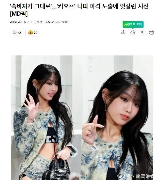 但反对的声音也不少,而且相当尖锐。很多韩网友指出,当天首尔气温骤降,还下着阴雨,在这种公共场合穿成这样,实在是“不合时宜的过度暴露”,甚至让人看着都觉得不舒服。一时间,关于“时尚自由的边界究竟在哪里”的讨论,在韩网那是炸开了锅。回到NATTY这件事儿上,我觉得吧,时尚本身就是个很主观的东西,每个人都有自己对时尚的理解和追求。品牌追求自由奔放、大胆不羁的风格,这也没错;艺人想要通过独特的造型来展现自己的个性和魅力,也无可厚非。但在追求时尚的同时,也得考虑一下场合和大众的接受程度。毕竟明星作为公众人物,他们的言行举止和穿着打扮,都会对社会产生一定的影响。话说回来,NATTY和她的团队可没被这争议影响太多。KISS OF LIFE在10月15号刚刚公开了日本出道先行曲《Sticky (Japanese Ver.)》,还宣布了下月5号要正式发行首张日本迷你专辑《TOKYO MISSION START》,全面开启日本活动。看来他们是要在事业上大步向前了。NATTY这次的“破格”亮相,就像一块试金石,精准地测试出了韩国网友对于明星穿着尺度的接受底线。在这个流量为王的时代,不知道下一次,又会有哪位明星以怎样独特的造型来挑战这条微妙的界限呢?咱们就拭目以待吧。